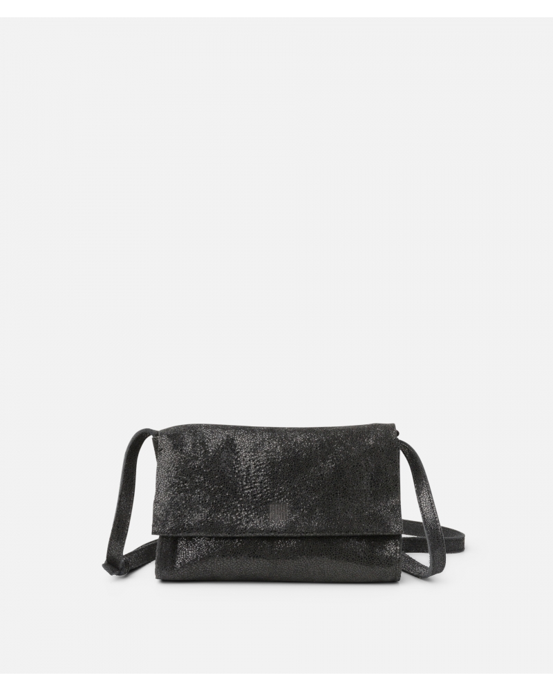 Bossa bandolera de pell bovina amb làmina craquelada que dona un efecte brillant a dos tons. Bandolera regulable. Tancament amb solapa, botó i cremallera. Butxaques interiors. Folre de cotó.