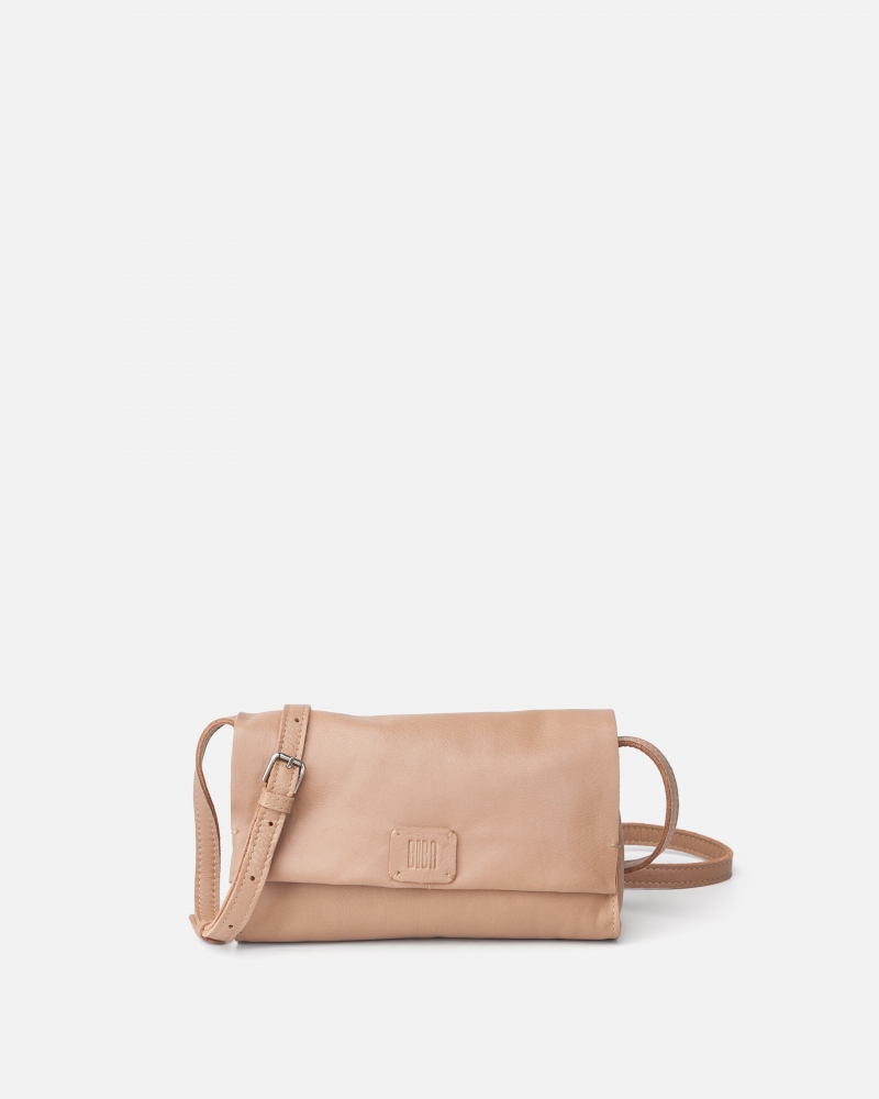 Bossa bandolera de pell ovina, de curtici¢ vegetal i local. Pell rentada per destacar el gra natural. Forma rectangular i bandolera ajustable. Solapa i tanca amb cremallera.