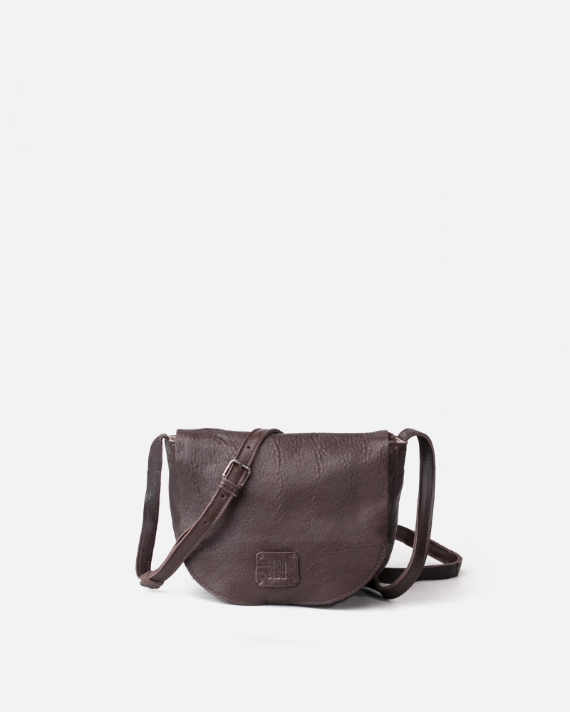 Bossa petita de pell ovina, curtici¢ vegetal i local. Pell rentada per destacar el gra natural. Forma mitja lluna. Bandolera ajustable. Solapa i tanca amb cremallera.