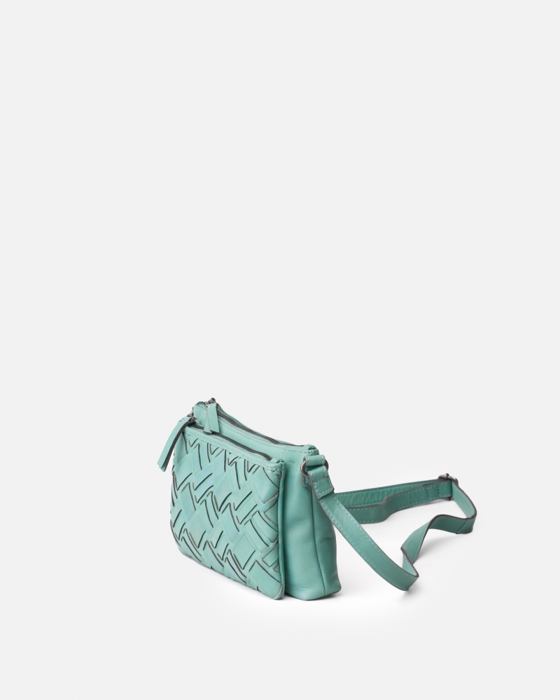 Bossa bandolera de pell bovina rentada i trenada a mà de curtició vegetal. Bandolera regulable, tancament de cremallera, múltiples butxaques internes i externes i folre de cotó.