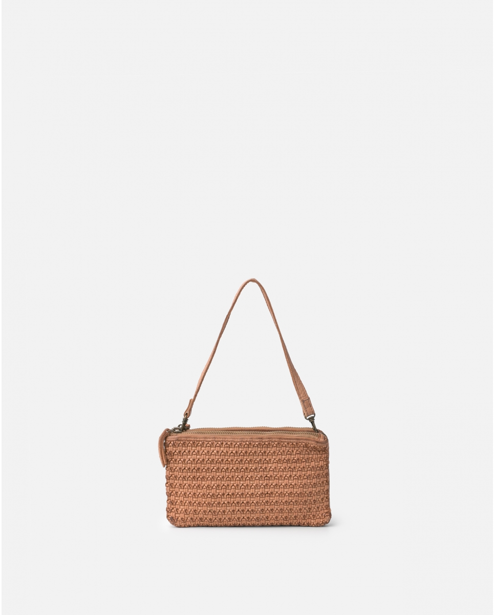 Mini bossa bandolera de pell bovina rentada i trenzada amb fil gruixut. Tres compartiments, dos dels quals es tanquen amb cremallera. Nansa d'espatlla petita i extraïble, bandolera regulable i extraïble, butxaques externes i internes, i folre de cotó.