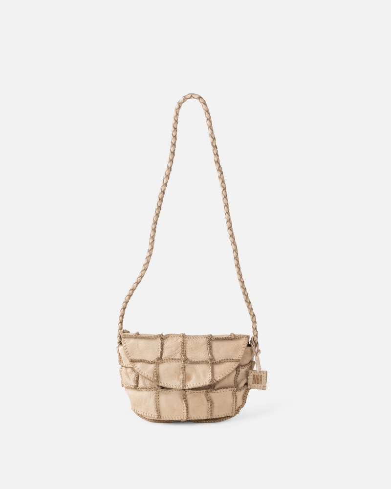 Bossa bandolera de pell vacuna rentada. Patchwork de diferents trossos de pell que, cosits entre si, formen la bossa. Tancament amb solapa i botó. Folre de cotó. Sense butxaques.