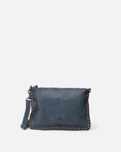 Cross bag de pell rentada i de curtició vegetal. Tatxes en el laterals. Tancament de cremallera, bandoelra regulable i extraîble, butxaques interenes i externes i folre de cotó.