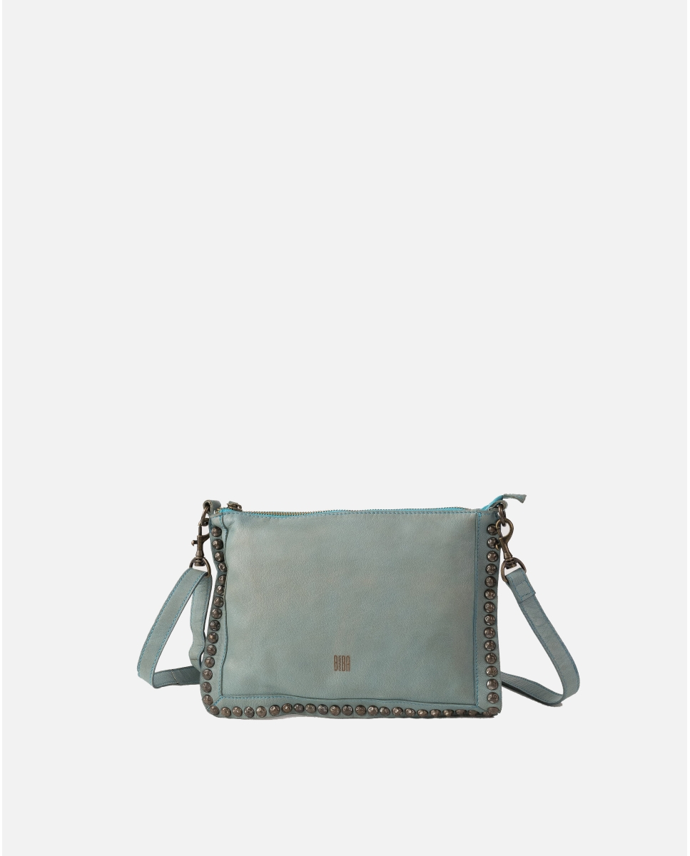 Cross bag de pell rentada i de curtició vegetal. Tatxes en el laterals. Tancament de cremallera, bandoelra regulable i extraîble, butxaques interenes i externes i folre de cotó.