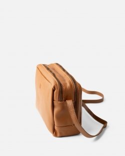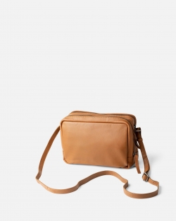 Bossa de pell natural amb tancament de cremallera, doble compartiment i bandolera regulable.