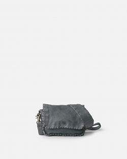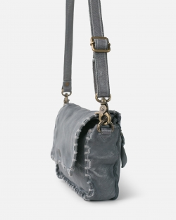 Bossa bandolera de pell bovina rentada. Costures decoratives de fil gruixut. Nansa d'espatlla extraïble, bandolera regulable i extraïble, solapa amb botó i tancament amb cremallera, butxaques externes i internes, i folre de cotó.