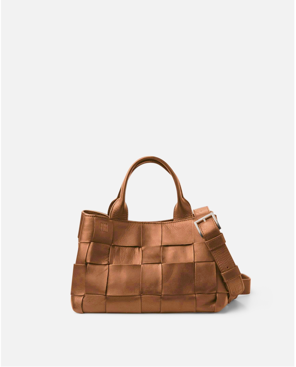 Bowling de pell bovina rentada i trenada en ambdues cares. Nanses de mà. Bandolera regulable i extraïble. Tancament amb botó. Dues compartiments interns. Múltiples butxaques internes. Folre de cotó.
