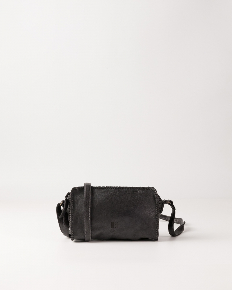 Bandolera de pell vacuna rentada i troquelada. Dos compartiments que es tanquen amb cremallera. Bandolera regulable. Folre de cotó.