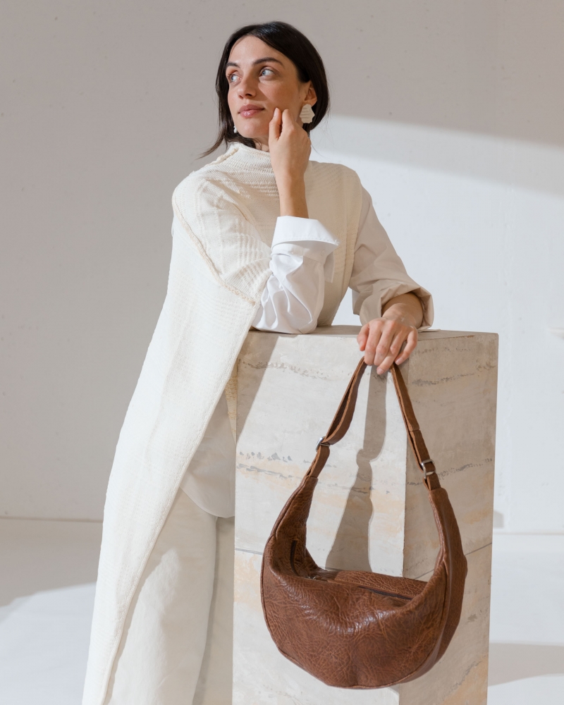 Hobo petit de pell ovina, efecte 'elefant' adquirit per bombeig de la pell. Nansa multiposició que permet portar-lo a l'espatlla o creuat. Tancament amb cremallera. Butxaques interiors. Folre de cotó.