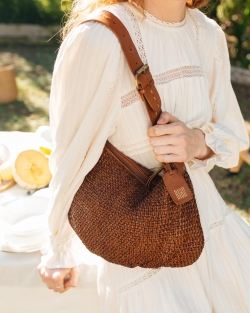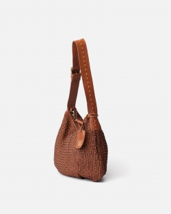 Mini hobo de pell rentada de curtició vegetal i trenada a mà. Una nansa, bandolera regulable i extraïble i tancament amb cremallera. Sense folre pero amb butxaca interior de cotó.