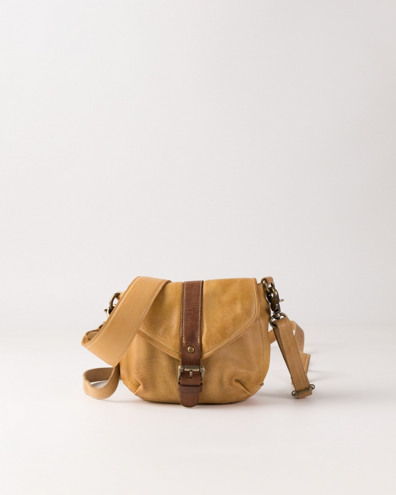 Bossa bandolera de pell vacuna rentada. Tancament amb solapa i cremallera. Nansa despatlla extraïble. Bandolera regulable i extraïble. Butxaques externes i internes. Folre de cotó.