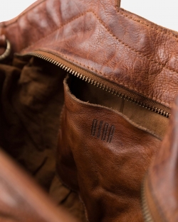 Cabàs petit de pell vacuna rentada i troquelada. Tancament amb cremallera. Nansa despatlla extraïble. Bandolera regulable i extraïble. Butxaca interna. Folre de cotó.