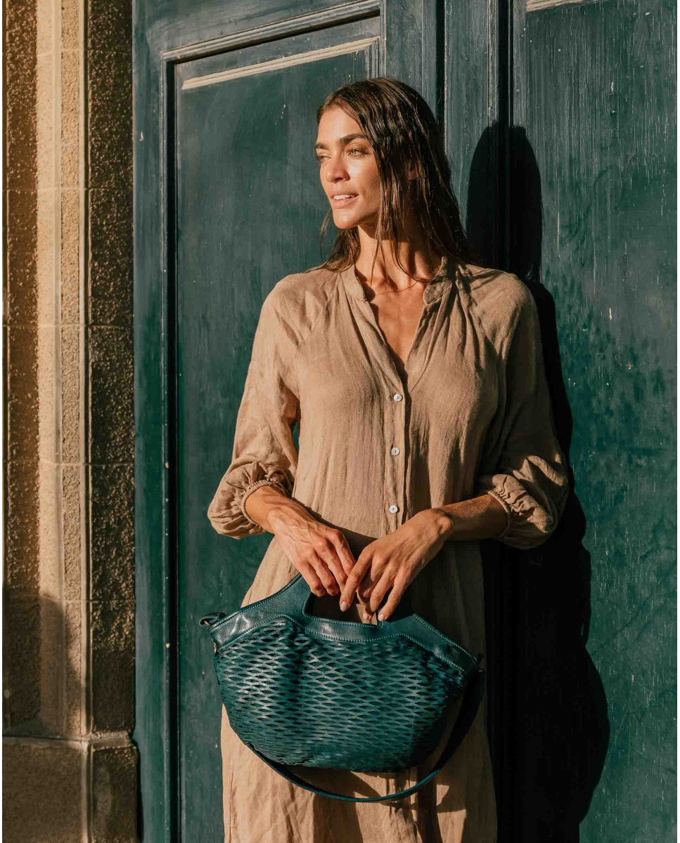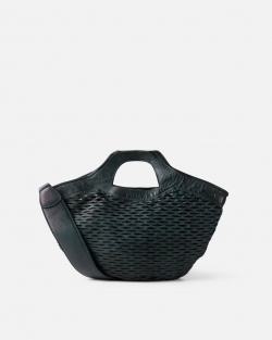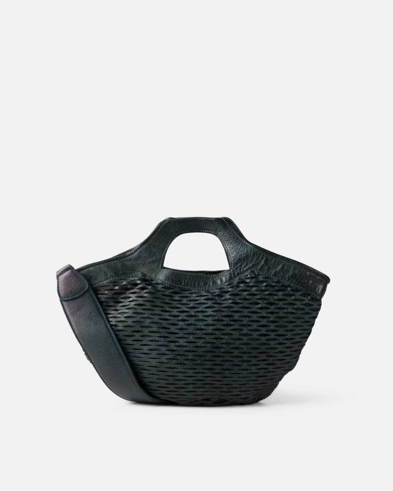 Cabàs petit de pell vacuna rentada i troquelada. Tancament amb cremallera. Nansa despatlla extraïble. Bandolera regulable i extraïble. Butxaca interna. Folre de cotó.