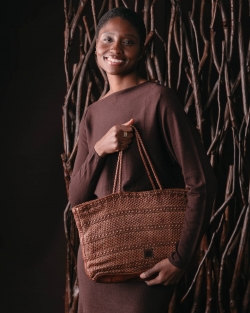 Shopper mitjà de pell bovina trenada. Tatxes decoratives a tot el bolso. Butxaca interna, sense folre ni sistema de tancament.