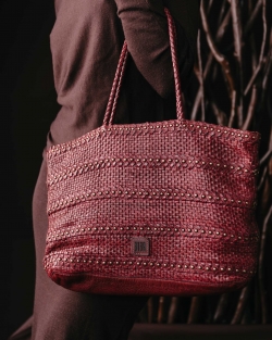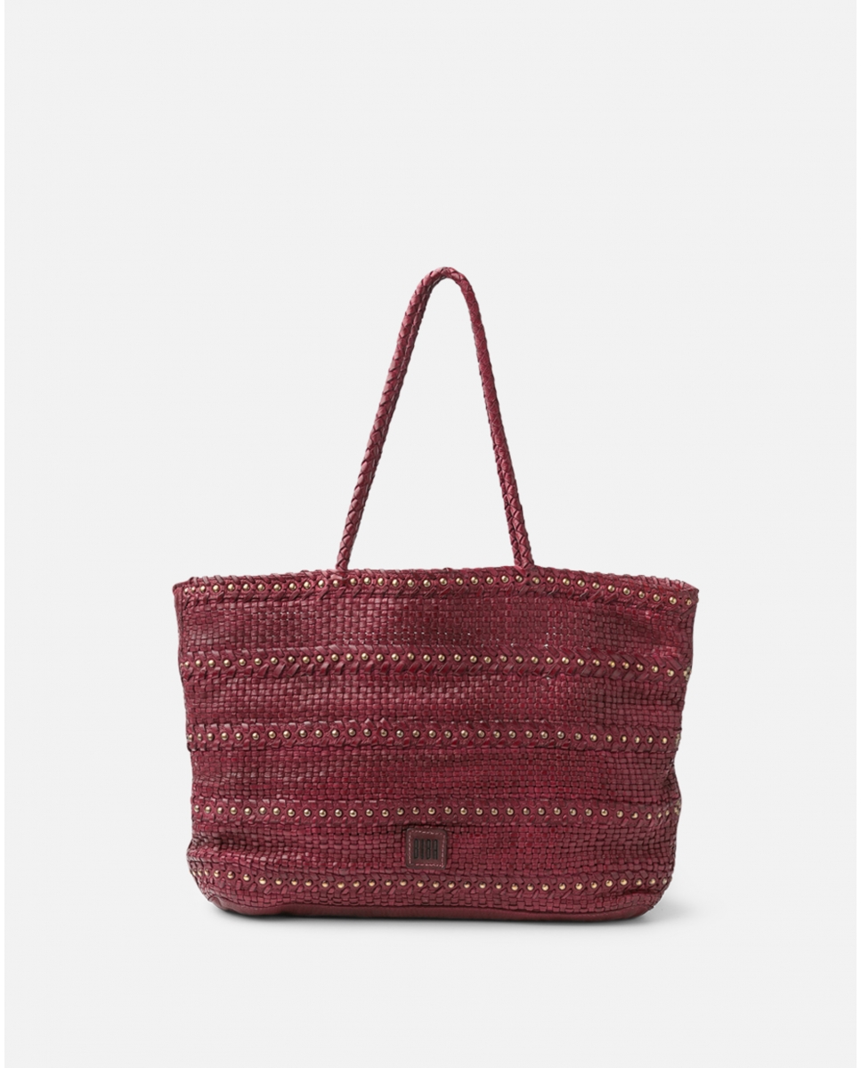 Shopper mitjà de pell bovina trenada. Tatxes decoratives a tot el bolso. Butxaca interna, sense folre ni sistema de tancament.