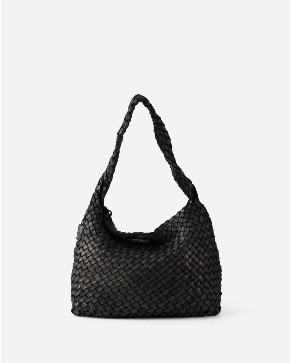 Hobo de pell vacuna rentada i trenada. Sense costures, és a dir, fet duna sola peça de pell trenada. Tancament amb imant. Butxaca interna. Sense folre.