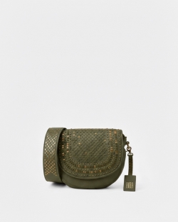 Bossa bandolera de pell vacuna rentada. Tacs decoratius a la solapa. Tancament amb solapa i cremallera. Nansa despatlla extraïble. Bandolera regulable i extraïble. Butxaques externes i interna. Folre de cotó.