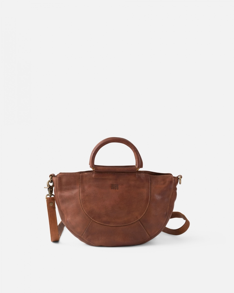 Bossa de mà de pell vacuna rentada. Nanses de mà folrades en pell. Tancament amb cremallera. Bandolera regulable i extraïble. Butxaques externes i internes. Folre de cotó.