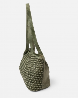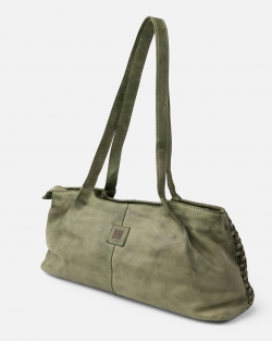 Shopper tipus baguette de pell vacuna rentada i trenada amb fil gruixut. Tancament amb cremallera. Butxaques externes i internes. Folre de cotó. Clauer ancorat a l’interior de la bossa.