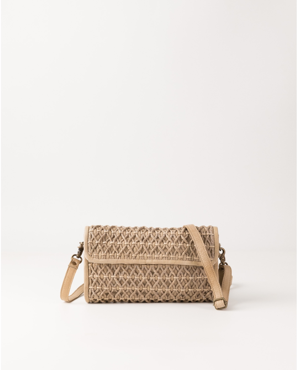 Bossa bandolera de pell vacuna rentada, enrotllada i trenada. Tancament amb solapa amb dos imants i tanca interior. Bandolera regulable i extraïble. Múltiples butxaques internes. Folre de cotó.
