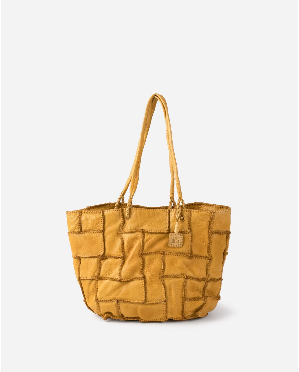 Shopper de pell vacuna rentada. Patchwork de diferents trossos de pell que, cosits entre si, formen la bossa. Tancament amb mosquetó central. Butxaques internes, una de molt gran (amb cremallera) al mig de la bossa. Folre de cotó.