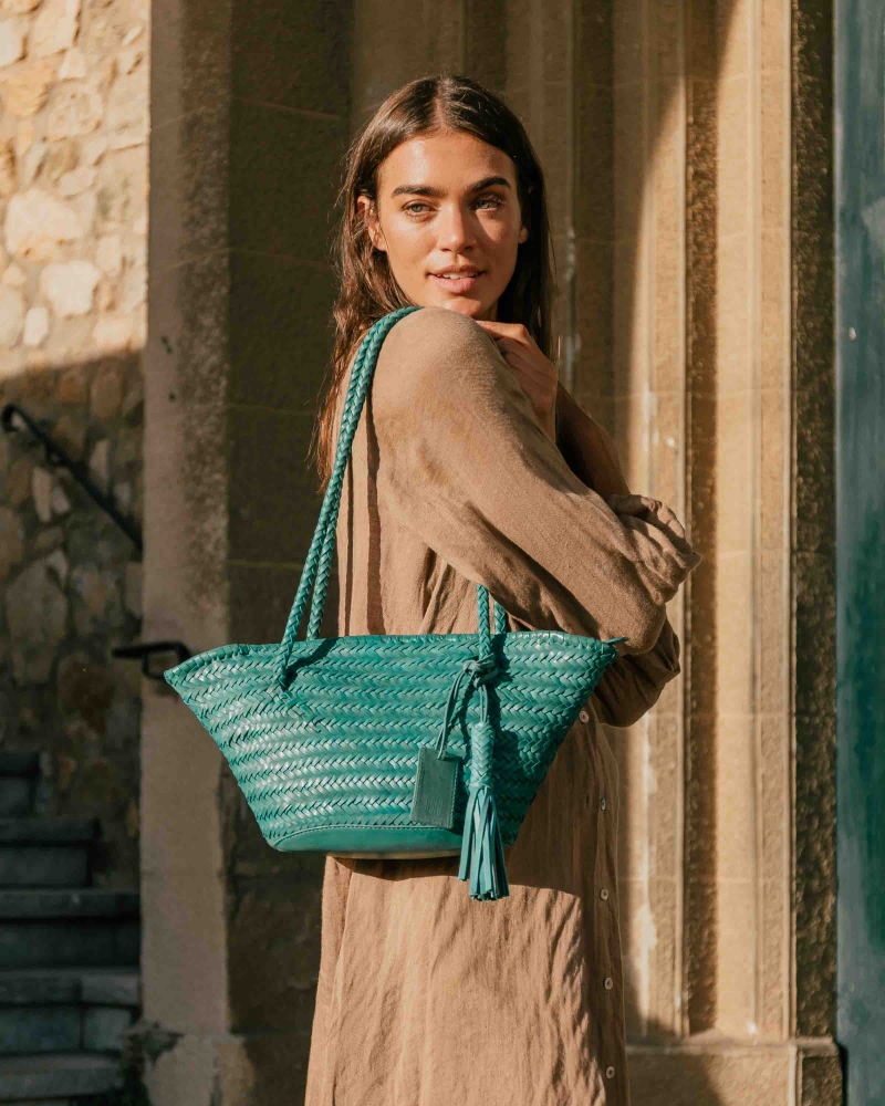 Cabàs petit de pell vacuna trenada. Tancament amb cremallera. Butxaques internes. Folre de cotó.