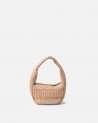 Mini hobo de pell bovina rentada. Motiu de punt de creu amb fil de cotó. Tancament amb cremallera, bandolera regulable i extraïble, butxaques internes, i folre de cotó.