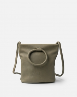 Bossa bandolera de pell bovina. Manegues de mà, tancament amb cremallera, bandolera regulable amb nusos, butxaques internes, i folre de cotó.