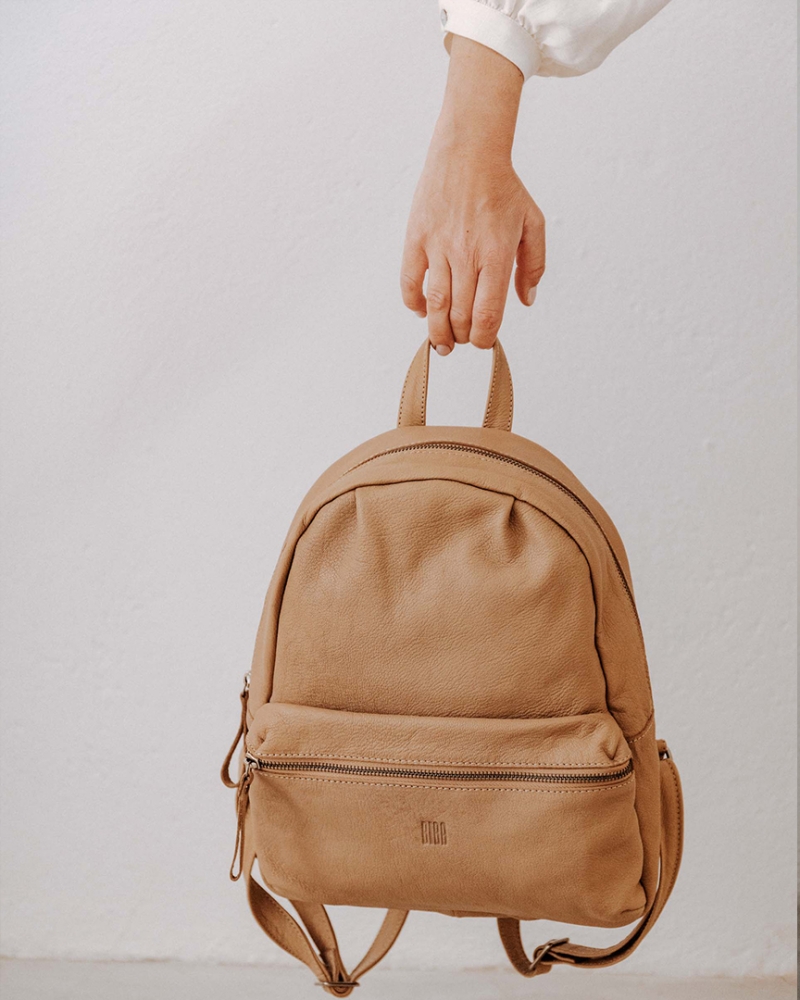 Motxilla de pell natural amb butxaca exterior. Tancament de cremallera, dues nanses i butxques a l'interior.