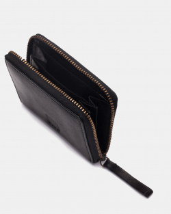 Bitlleter petit de pell bovina, rentada i de curtició vegetal. Tancament amb cremallera i compartiments per a targetes.
