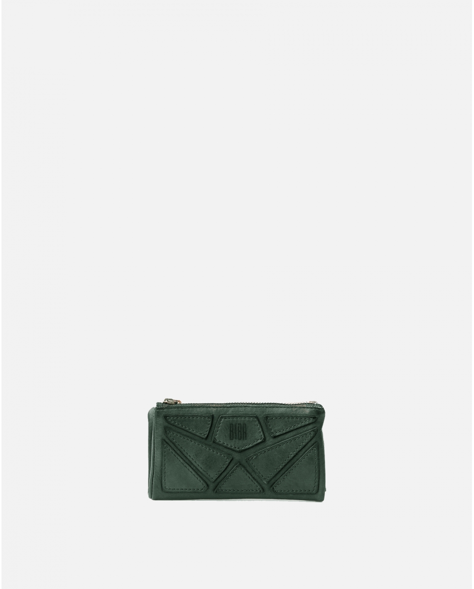 Bitlleter mitjà de pell bovina rentada i trenada. Destaca el patchwork de pell a la part frontal. Tancament amb botó. Compartiments per a bitllets, targetes i monedes. Sistema de seguretat RFID.