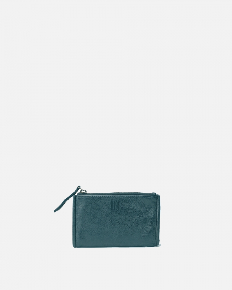 Bitlleter mitjà de pell bovina rentada i de curtició vegetal. Tancament amb botó, compartiments per a targetes, bitllets i monedes.