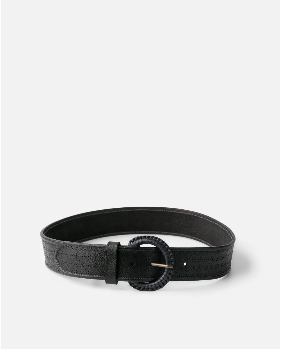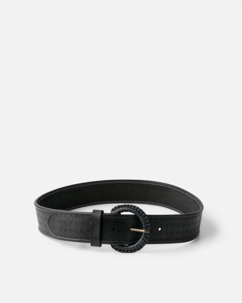 Cinturó de pell bovina. Troquelat floral. 5 cm d'amplada. Cargol posterior per tallar-lo manualment. Sivella forrada en pell.