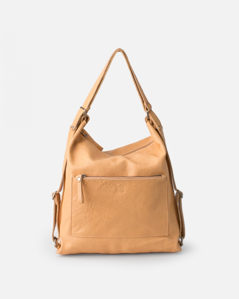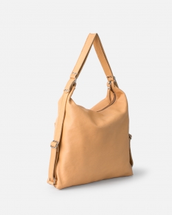 Vegetable and locally-tanned sheep leather backpack, convertible into a hobo bag. Zip closure, external and internal pockets, and non-inner lining.