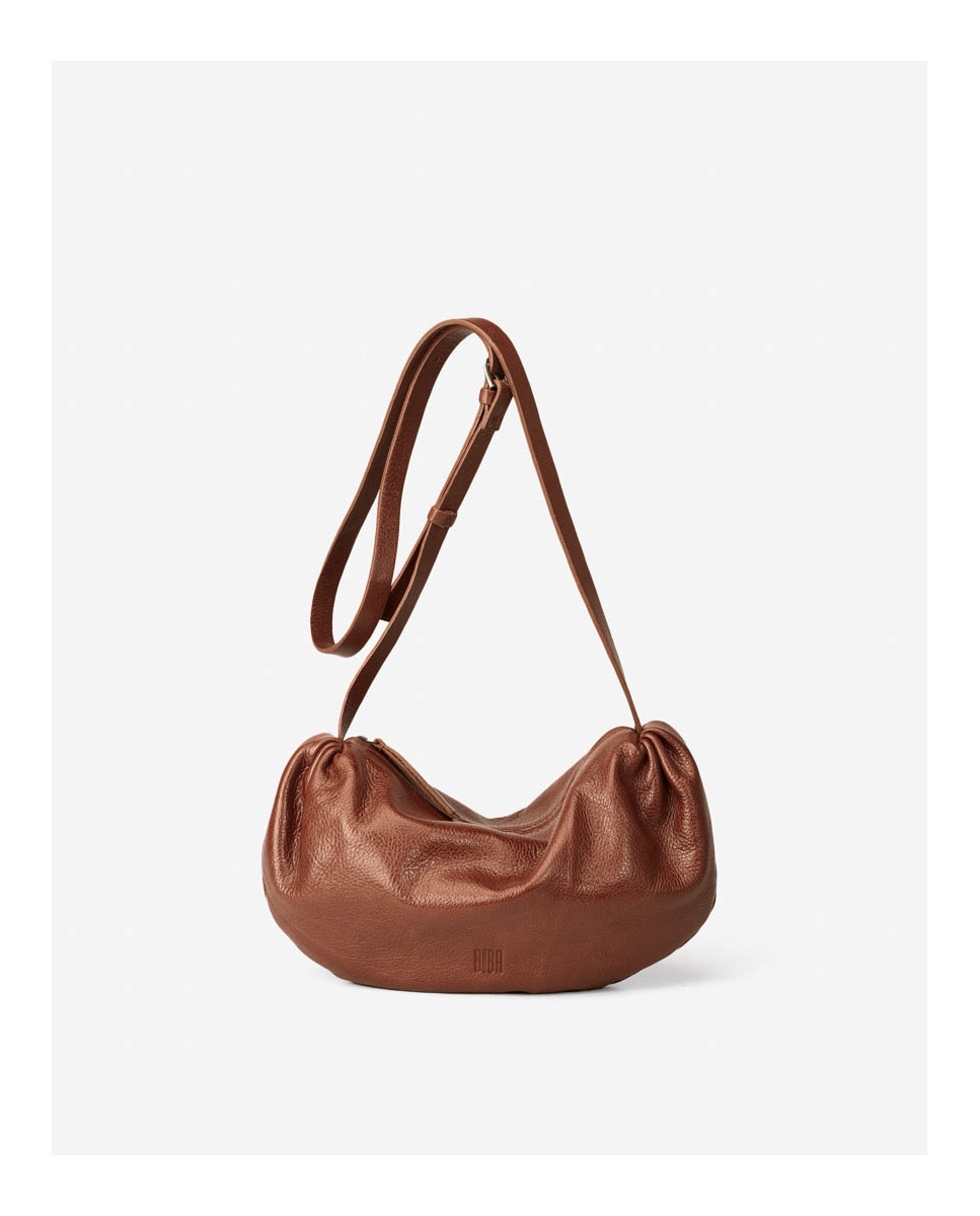 Vegetable and locally-tanned sheep leather cross bag. Luxe finish that provides shine and two-tone effect. Zip closure, adjustable shoulder strap, internal pockets, and cotton lining.