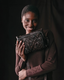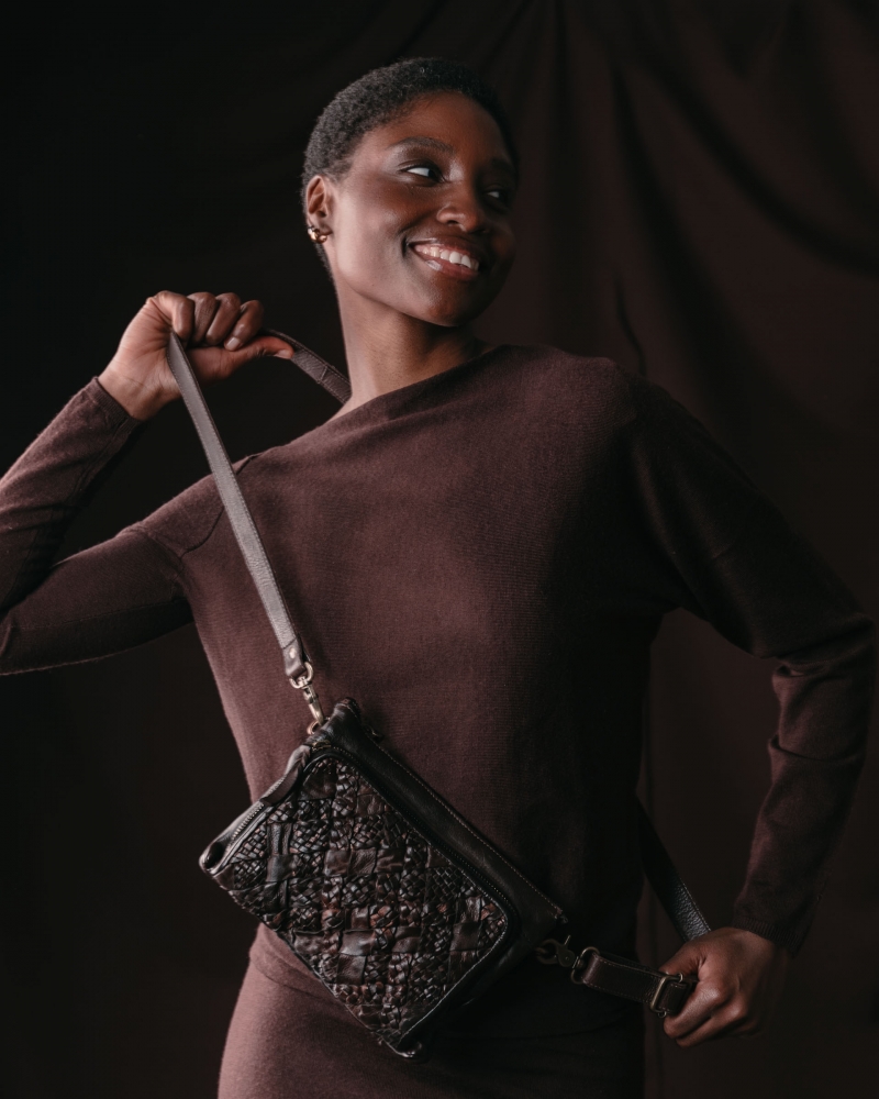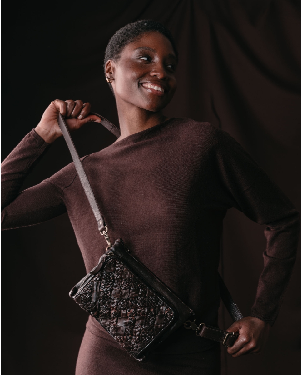 Washed, braided and iridescent cowhide shoulder bag. Adjustable and removable shoulder strap. Zip closure. Two internal compartments. Multiple external and internal pockets. Cotton lining.