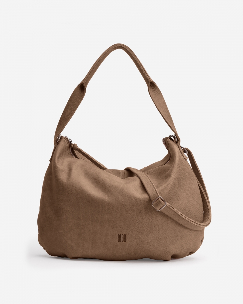 Bag with zip closure, one handle, adjustable and removable shoulder strap and pockets inside.