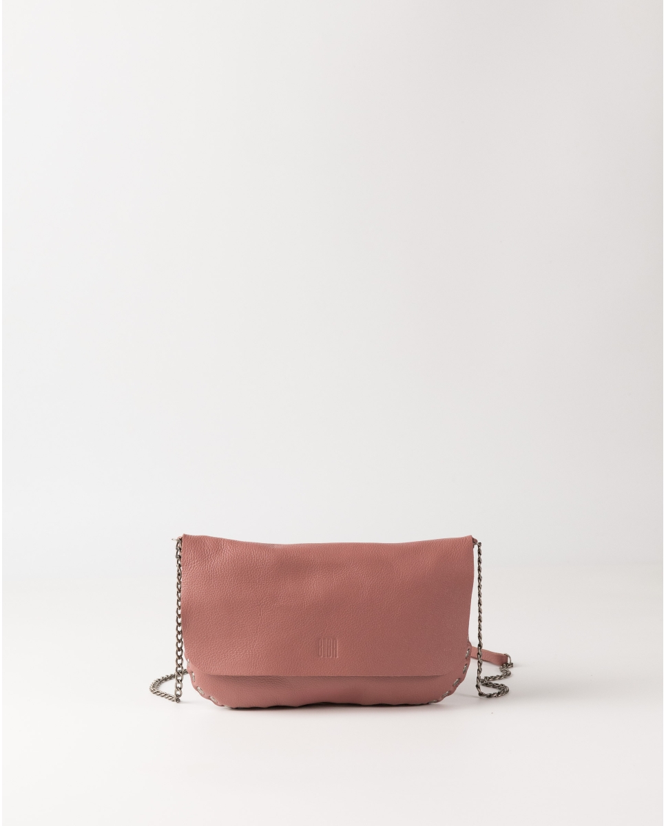 Cowhide leather crossbody bag with decorative studs along the entire edge. Flap and zip closure. Adjustable strap made of leather and chain. Interior pocket. Unlined.