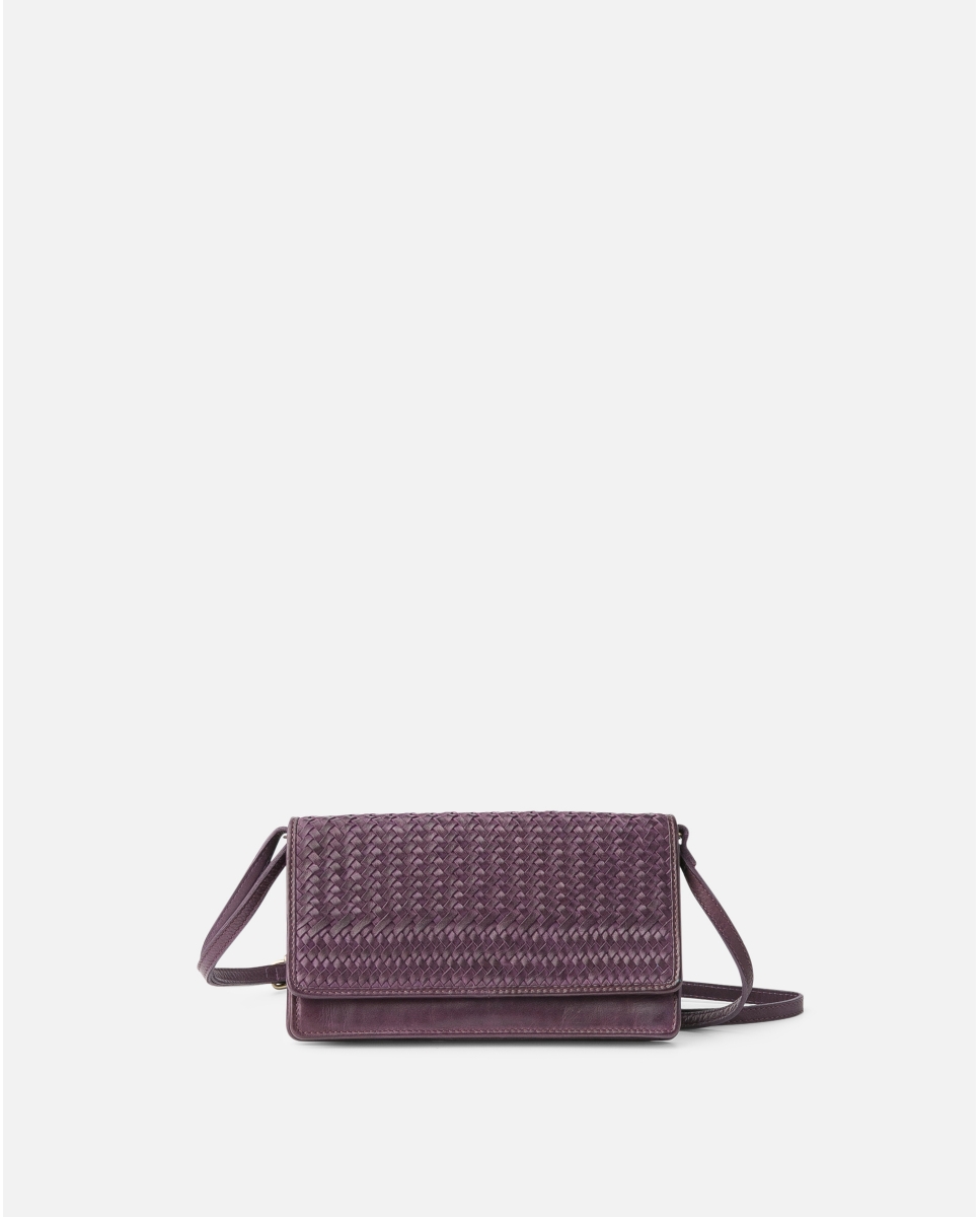 Washed and braided cowhide mini bag/wallet. Adjustable shoulder strap. Flap with button closure. Compartments for cell phone, bills, cards and coins. RFID security system.