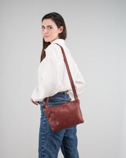 Washed, and vegetable-tanned cowhide leather cross bag. Characteristic hand-made stitching of the collection on the top of the bag. Two main compartments with zip closure, external and internal pockets, adjustable shoulder strap, and cotton lining.