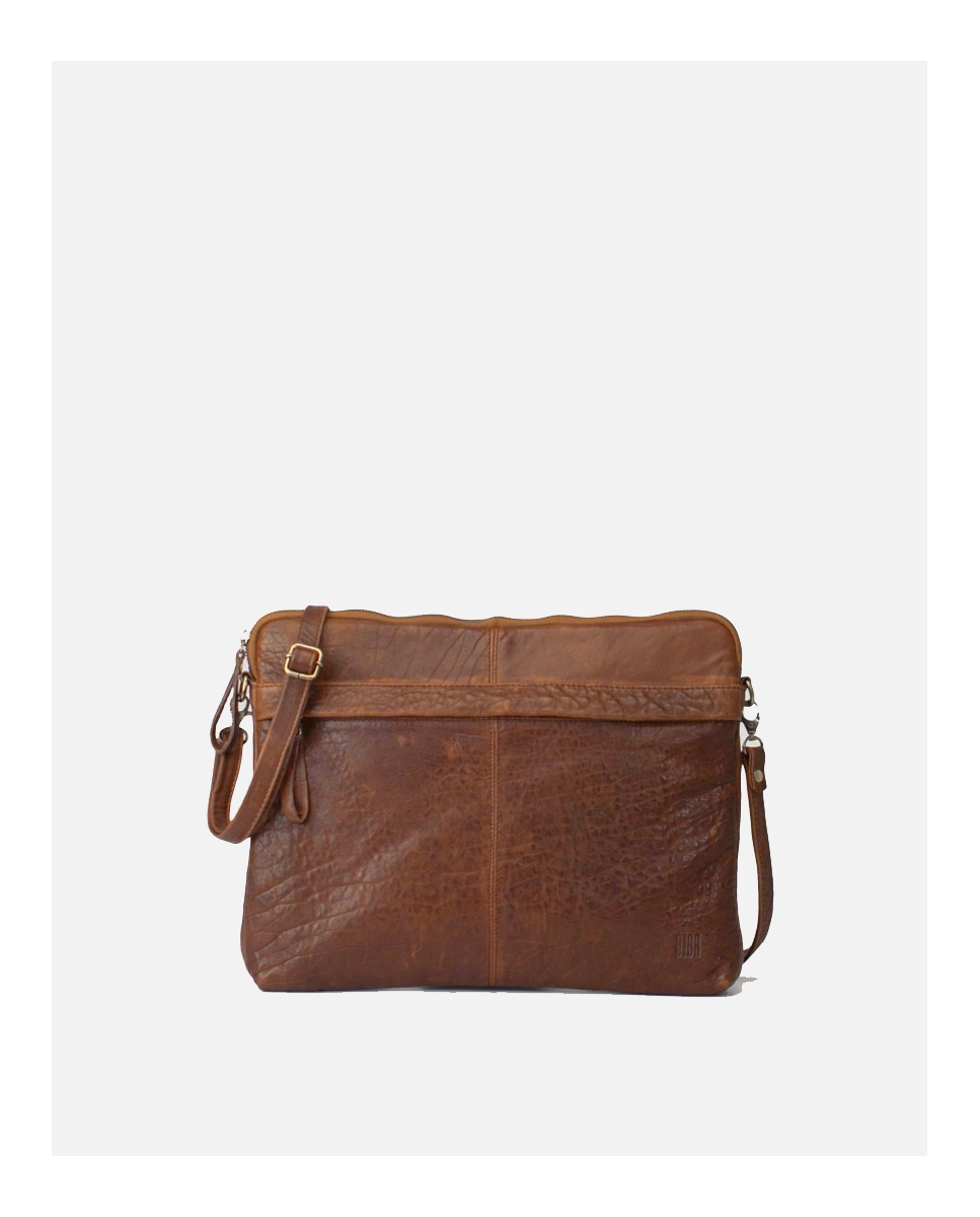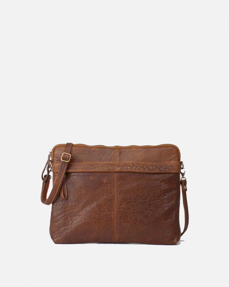 Vegetable and locally-tanned sheep leather laptop case. The leather is washed to highlight the natural grain. Padded, adjustable and removable shoulder strap, zip closure, internal and external pockets, and cotton lining.