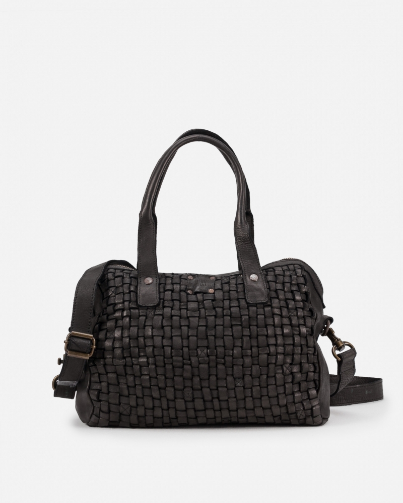 Washed, vegetable-tanned, and hand-braided cowhide leather bowling bag. Handles, adjustable and removable shoulder strap, zip closure, internal and external pockets, and cotton lining.