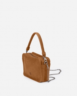 Local and vegetable-tanned cow leather cross bag. Worn effect and shiny finish. Chain strap and leather shoulder strap, both removable. Multiple zippered compartments.