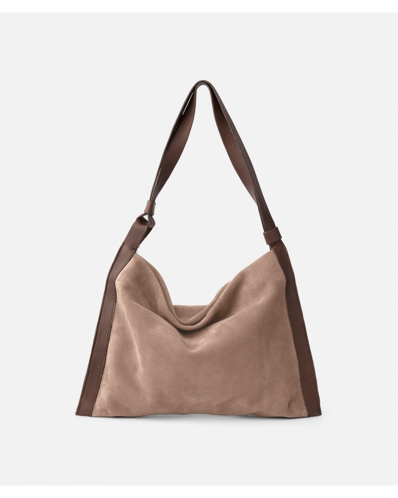 Water-repellent suede hobo. Shoulder strap. Zip closure. Internal pockets. Cotton lining.
