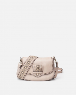 Washed cowhide leather cross bag. Complex manual work of studs and laser cutting on the flap and shoulder strap, the latter being removable. Zipper closure, adjustable and removable crossbody strap, external and internal pockets, and cotton lining.