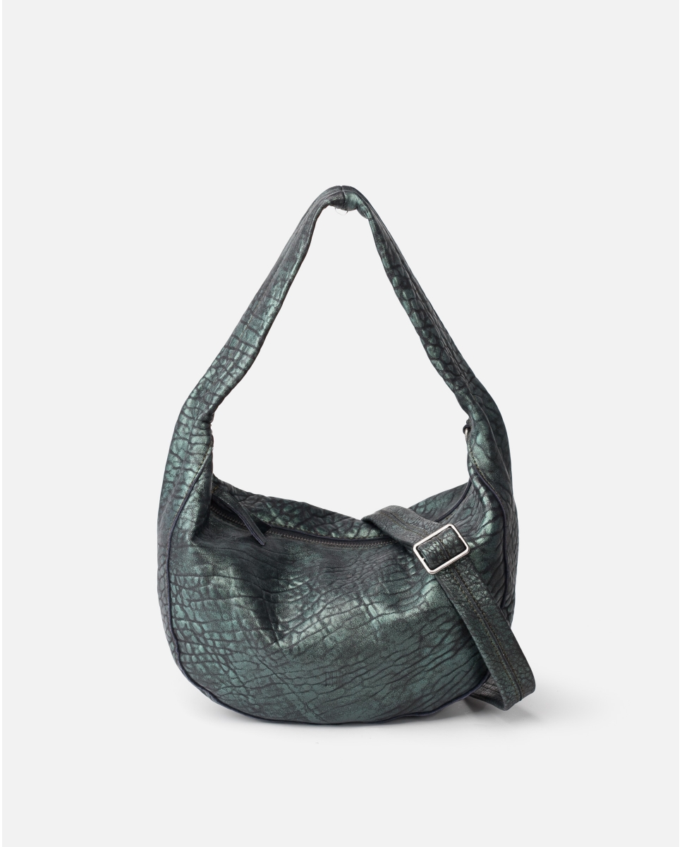 Metallic sheep leather hobo bag. Shoulder strap, adjustable and removable crossbody strap, zipper closure, internal pockets, and cotton lining.