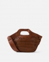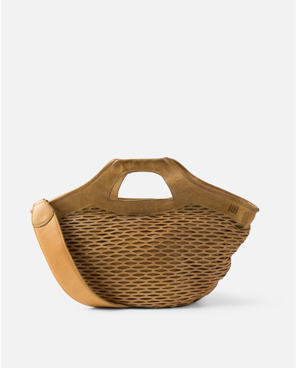 Small basket-style bag made of washed and perforated cowhide leather. Zip closure. Detachable shoulder strap. Adjustable and detachable crossbody strap. Interior pocket. Cotton lining.