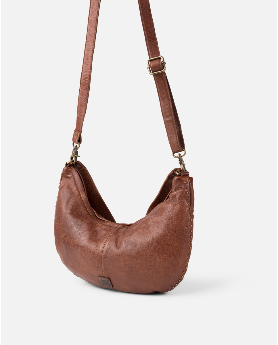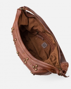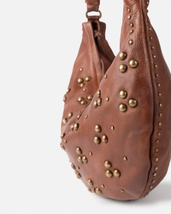 Washed cowhide leather hobo bag with decorative studs on the front. Zip closure. Adjustable and detachable crossbody strap. Interior pockets. Cotton lining.