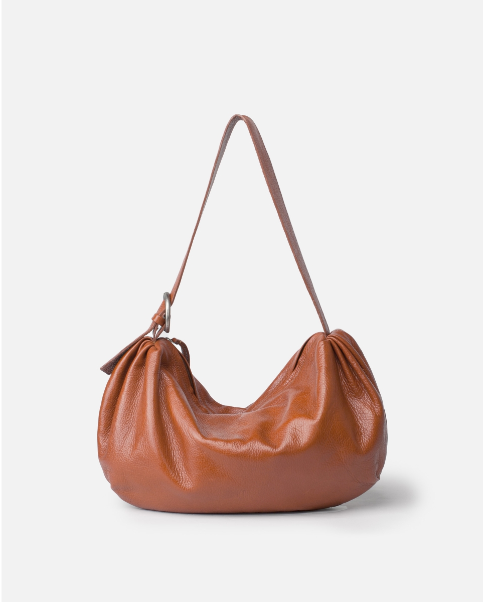 Vegetable and locally-tanned sheep leather hobo bag. Luxe finish that provides shine to the leather and a two-tone effect. Adjustable shoulder handle, zip closure, internal pockets, and cotton lining.