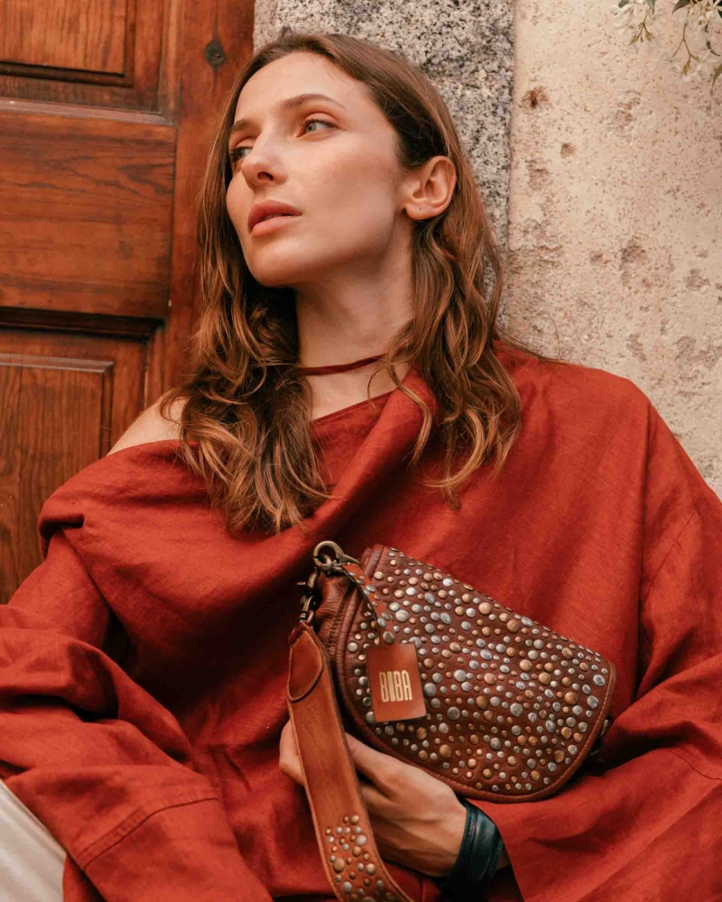 Washed cowhide leather crossbody bag with decorative studs on the flap. Flap and zip closure. Detachable shoulder strap. Adjustable and detachable crossbody strap. External and internal pockets. Cotton lining.
